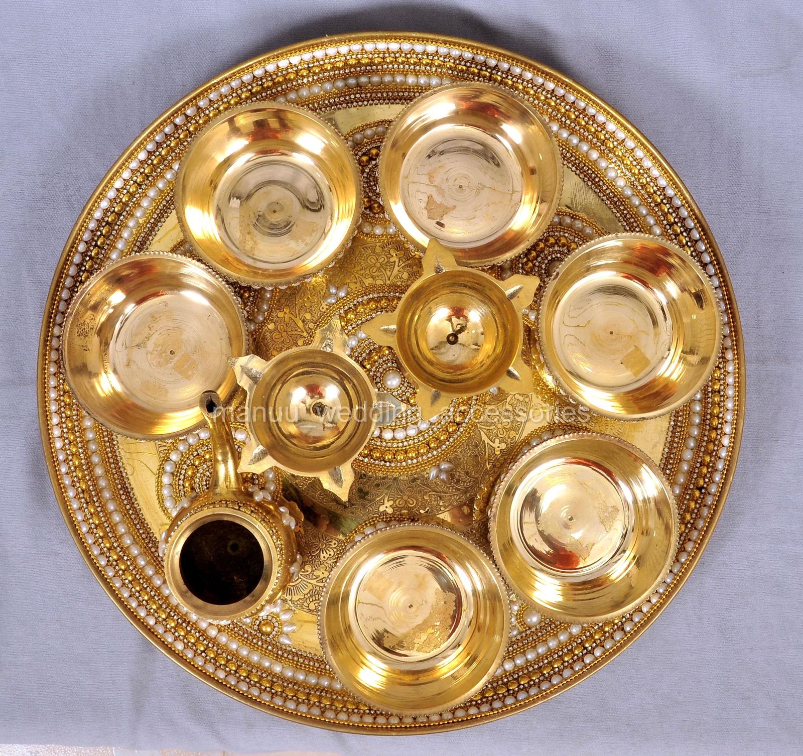 Beautifully decorated with good quality of brass Mangala Harathi Set available. The front part of the items is decorated with kundans, pearls, stones, and ball chains.